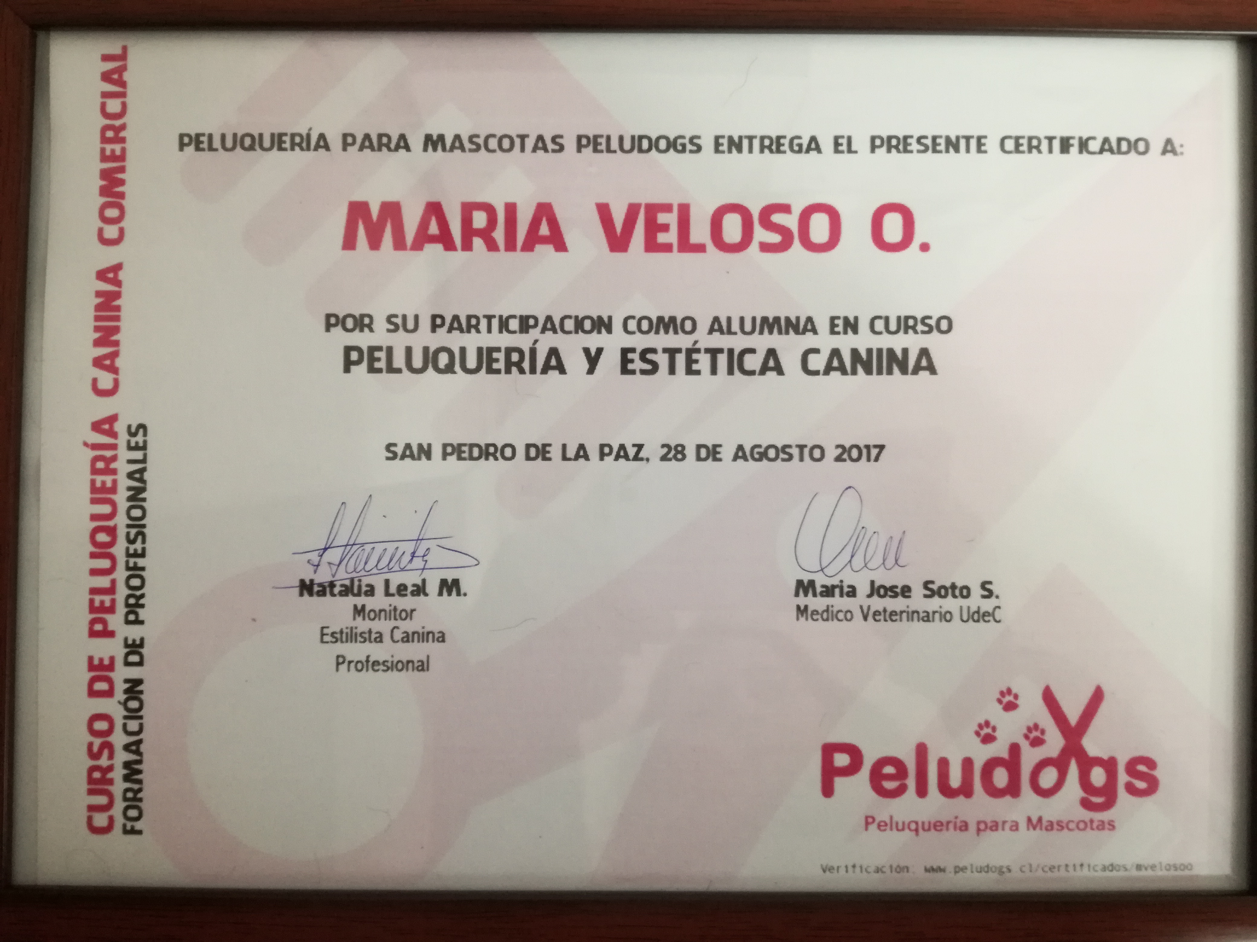Alumna del Curso de Peluquería Canina Comercial, con un 100% de asistencia otorgamos el siguiente certificado: